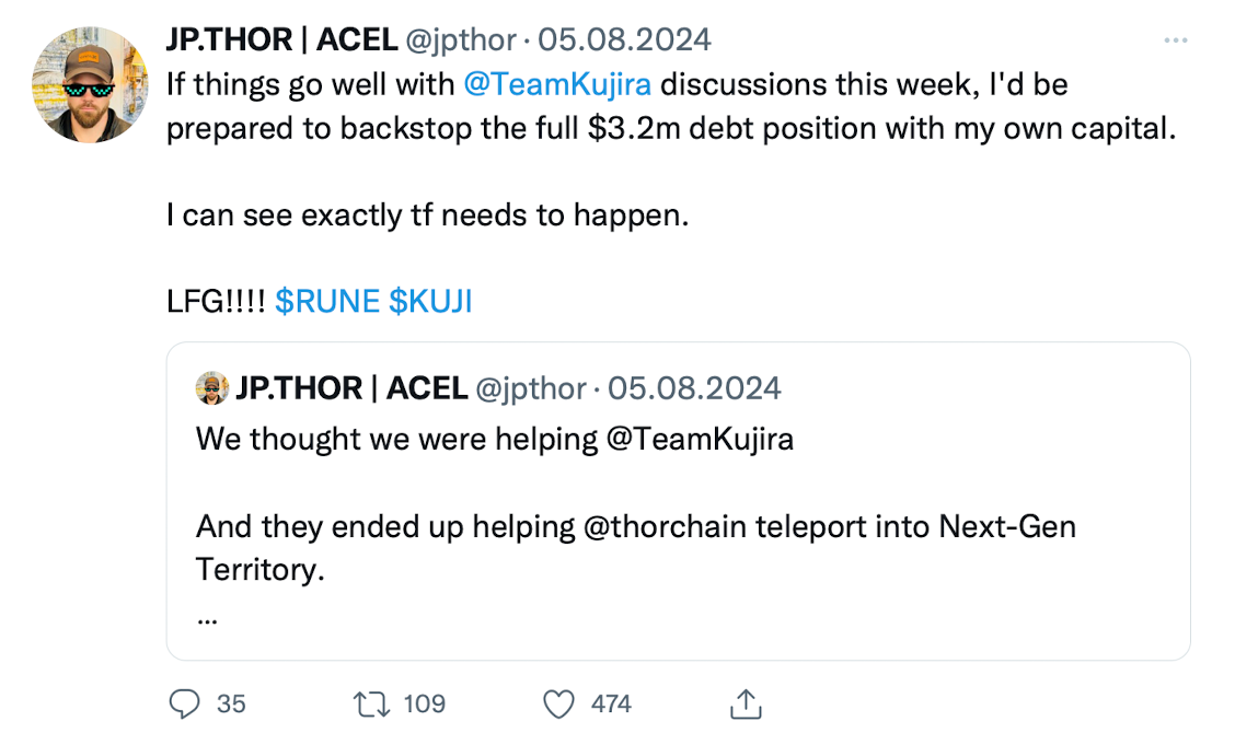 While the community was busy debating the merits of a bailout with all the inherent calm and rationality of CT threads, enter stage left: JP Thor, the eccentric Australian founder of Thorchain, industry heavyweight, and self-proclaimed "cosmos OG", riding in on his proverbial white kangaroo to save the day.